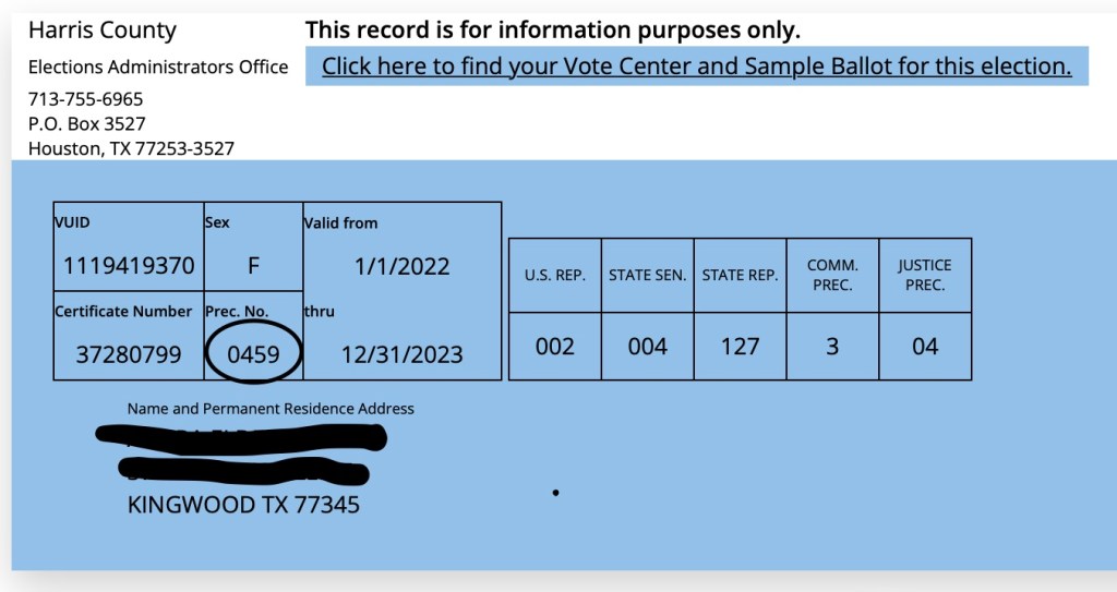 You may also look at your voter registration card to determine your exact precinct. See Below.